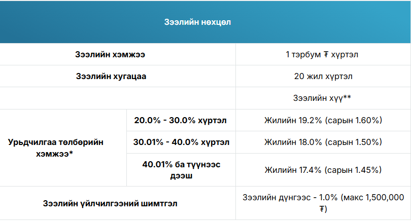 - Зээлдэгчийн татварын дараах орлогын 50 хувь нь зээлийн сарын төлбөрт хүрэлцэж байх.