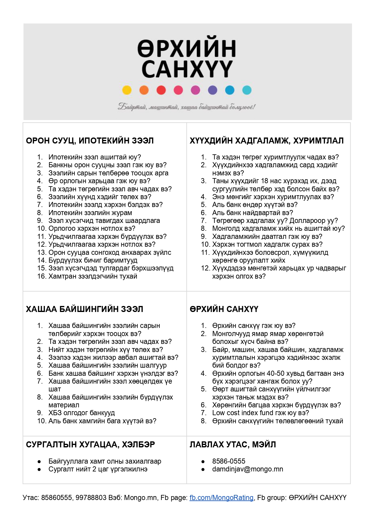 МӨНГӨ.МН сайт нь иргэдэд санхүүгийн зөвлөгөө өгсөн 12 жилийн туршлага, ур чадвар дээрээ үндэслэн ӨРХИЙН САНХҮҮГИЙН СУРГАЛТ зохион байгуулж байна.